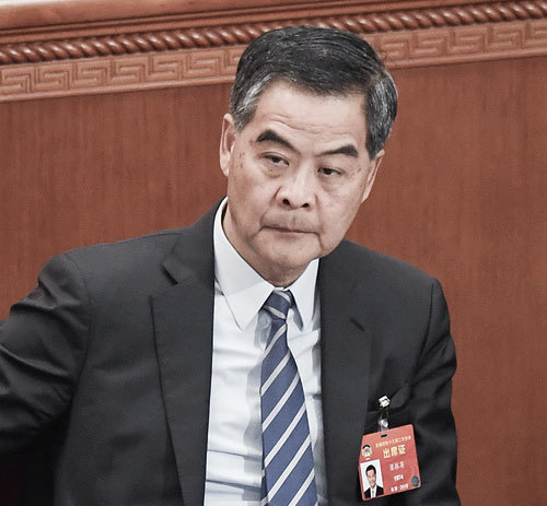 香港前特首梁振英(中)在臉書上公布《蘋果日報》全版廣告商名稱,向廣告商施壓。梁振英是政協副主席,他否代表中共在香港撕裂社會?(AFP)