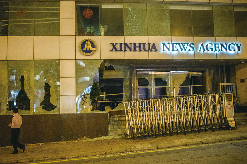香港主權移交之初,北京原擬撤除新華社以防日後成為香港第二權力中心。圖為2019年11月2日港人「求援國際 堅守自治」大集會,警察在灣仔施放催淚彈,新華社分社大樓被破壞。(AFP)