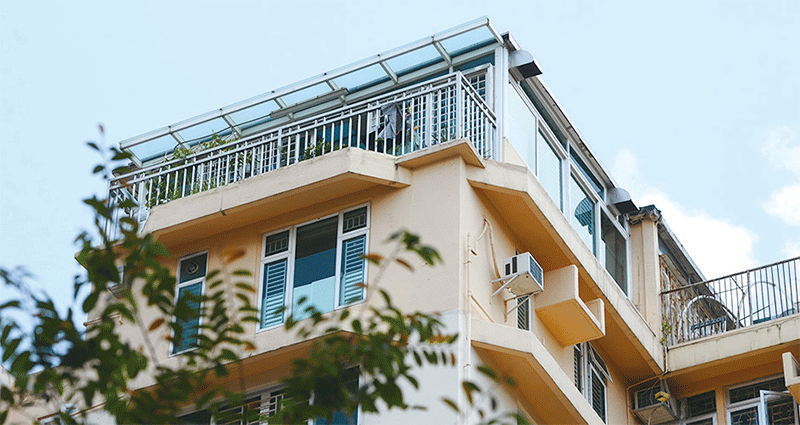 鄧炳強曾租住的九龍塘廣播道老牌豪宅寶能閣高層複式單位,相連的天臺一直存在違法僭建物。(宋碧龍/大紀元)