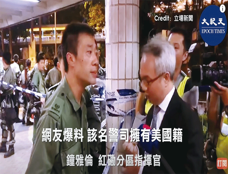 有民眾起底向孕婦實施暴力的警察名叫鍾雅倫,是紅磡分區指揮官,擁有美國國籍。(視頻截圖)