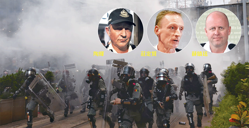 陶輝、莊定賢及薛鎮廷三名英籍警官被指參與警暴問題。香港眾志黃之鋒認為,要將涉事警官的違法事件推上國際媒體,繼續推動英政府關注。(新紀元合成圖)