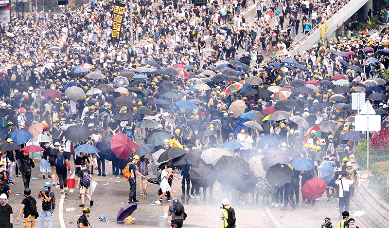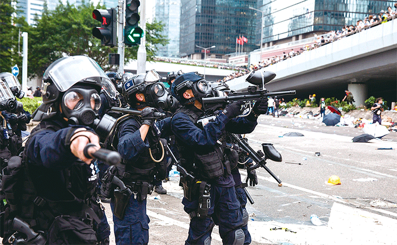 英籍警官莊定賢曾在去年6月12日立法會抗爭現場下令對抗爭者進行無差別攻擊。圖為當天「速龍」小隊在海富巴士總站向民眾射擊催淚彈、布袋彈,驅趕民眾。(AFP)