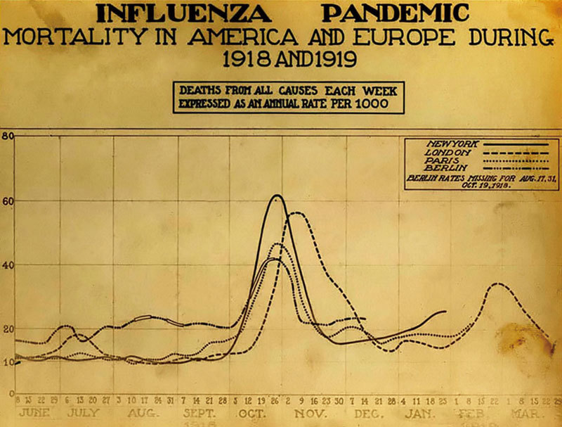 1918西班牙大流感期間,紐約、倫敦、巴黎和柏林在1918年6月至1919年3月的死亡率。單位:每千人。(公有領域)