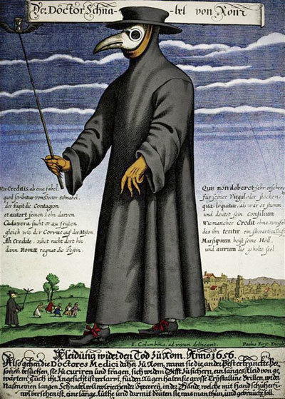 史載,黑死病肆虐時期歐洲專門醫治病患、穿著長袍的「烏嘴醫生」,會使用一種木製的拐杖碰觸病人治病,也會鞭打病人。(公有領域)