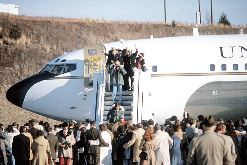 美國曾剝奪過伊朗及黎巴嫩的「主權豁免權」。圖為1981年1月從伊朗人質危機事件中獲釋返美的人質,攝於紐約州斯圖爾特空軍基地機場。(公有領域)