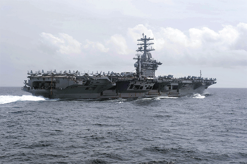 美軍核動力航母「尼米茲號」(圖)及「列根號」近期先後前往西太平洋地區部署,警告中共「不要以為疫情令美國無法應付戰爭」。(AFP)