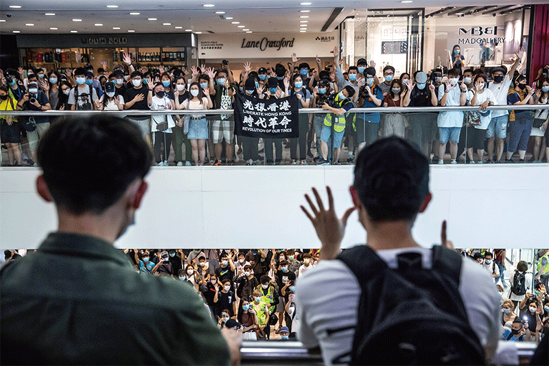 5月10日母親節,香港再現抗爭場面,民眾聚集合唱《願榮光歸香港》,比「五大訴求缺一不可」的手勢,喊「光復香港 時代革命」、「天滅中共」。(宋碧龍/大紀元)