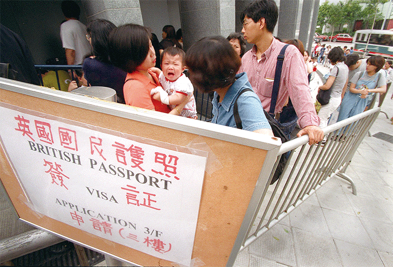 英相約翰遜6月3日指,若中共執意強推港版國安法,英國接受290萬香港人移民。圖為1997年6月20日香港主權移交中共前夕,英國文化協會外申領英國國民(海外)護照的港人大排長龍。(Getty Images)