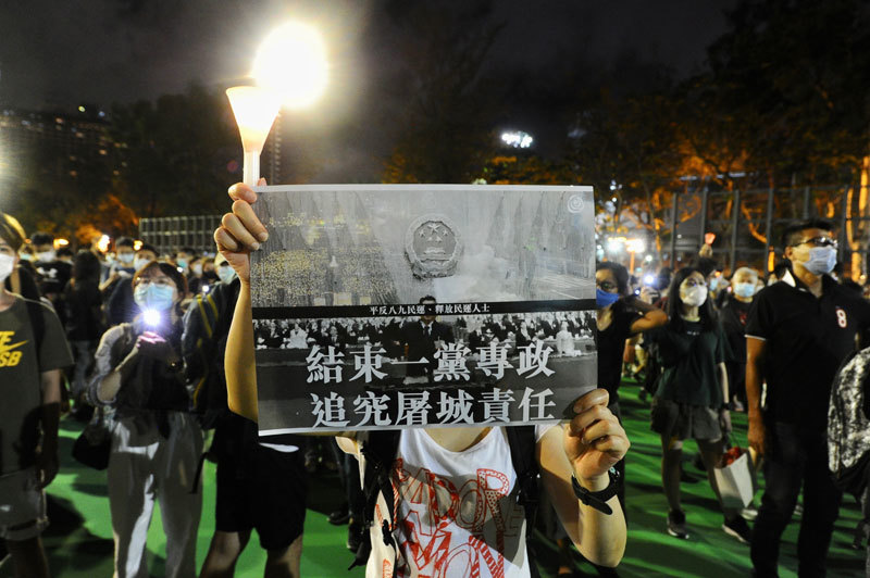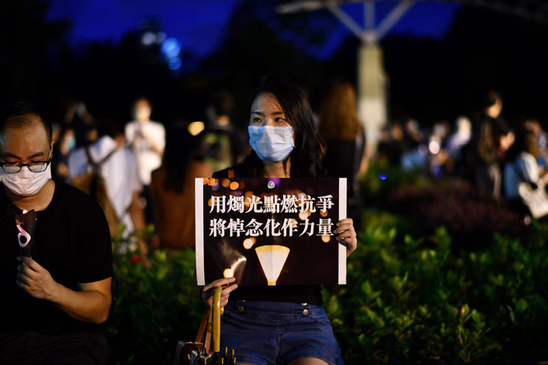 2020年6月4日,香港市民抵達維園,並舉起蠟燭悼念「六四」受難者。圖中一參與者舉著標語。(AFP)
