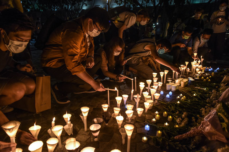 除了維園六四燭光悼念晚會外,很多港人響應支聯會的號召,在全港十八區舉行遍地開花悼念活動。圖為香港尖沙咀海濱花園民眾點燃燭光悼念六四亡魂。(AFP)