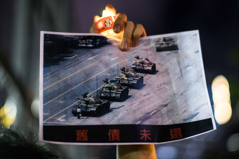 6月4日維園燭光悼念六四亡魂,港人手持「坦克人」畫面海報,提醒毋忘中共血債未還。(AFP)