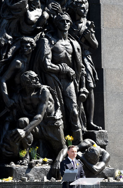 波蘭總統安德烈.杜達2018年4月19日在華沙猶太區英雄紀念碑前致詞,紀念華沙猶太區起義75周年。(AFP)