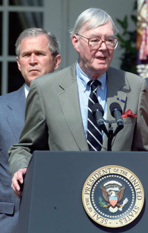 1975 年莫伊尼漢一家離開印度時,前美國總統老布什邀請莫伊尼漢的父親訪問北京,莫伊尼漢和哥哥隨行。圖為 2001 年 5 月 2 日莫伊尼漢父親在布什總統簽署一份行政命令之前發言。(AFP)