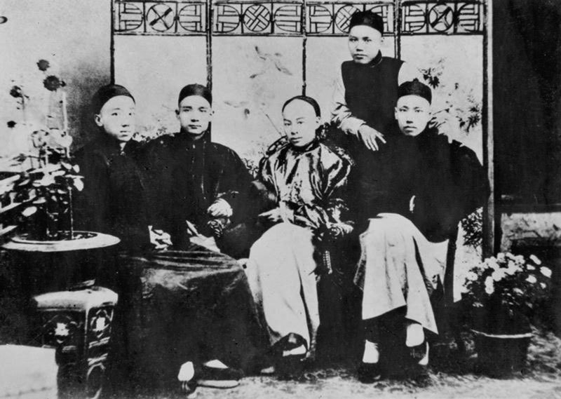 1895年,孫中山在香港集合陳少白等舊友,成立興中會總會。前排左起為楊鶴齡、孫中山、陳少白、尢列,後立者為關景良。攝於香港華人西醫書院。(公有領域)