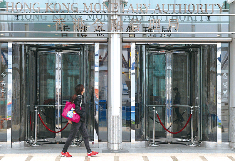港人移民他國,人才流失的同時也伴隨資金和財富的流失,可能衝擊香港的房價樓市以及聯繫匯率的穩定。圖為香港金融管理局。(AFP)