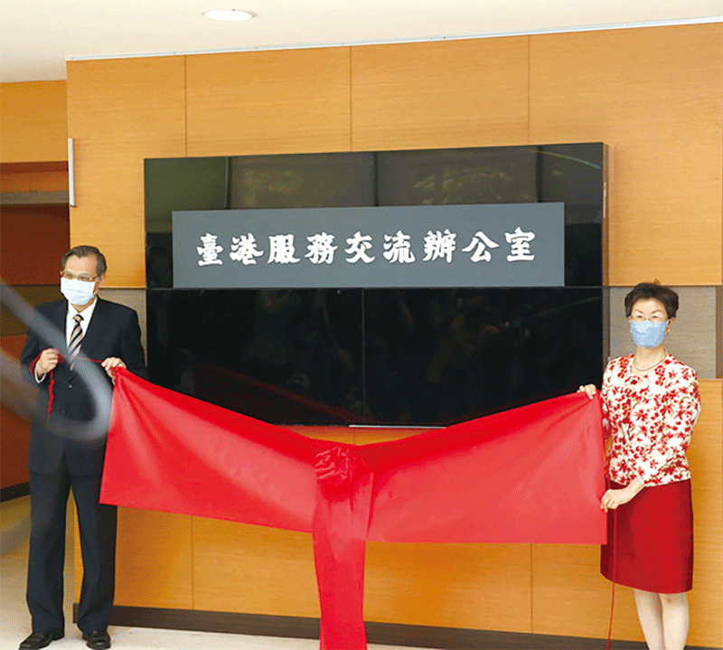 臺灣陸委會主任委員陳明通(左)、臺港經濟文化合作策進會董事長張小月(右)7月1日為「臺港服務交流辦公室」揭牌,促進臺港正向交流互動。(中央社)