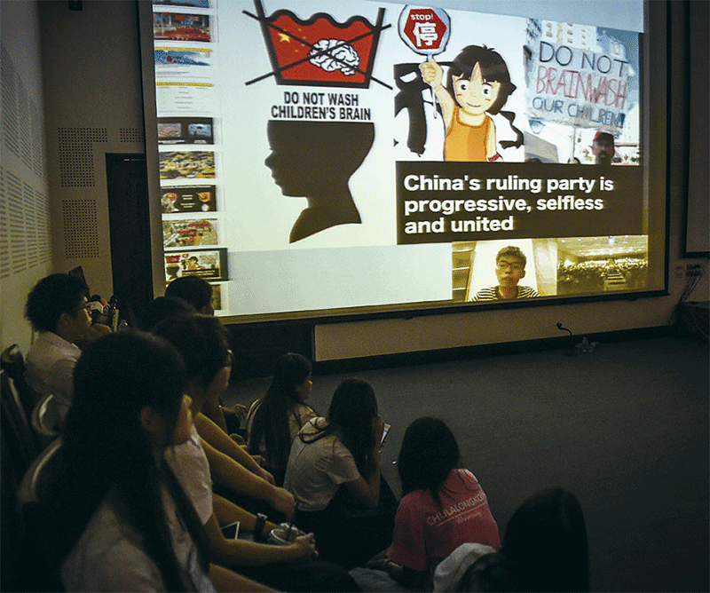 部分港人選擇移民,是因為不願子孫接受中共洗腦教育,無法與國際接軌。圖為2016年10月5日,此前一天遭泰國遣返香港的黃之鋒透過視訊完成原定的泰國朱拉隆功大學演講。(AFP)