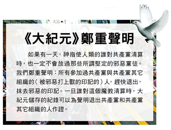 〈大紀元鄭重聲明〉。