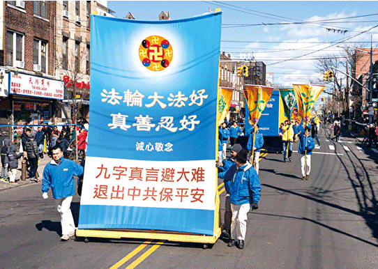 預言說「真、善、忍」是劫難中拯救人類的法寶。創世主的弟子在大瘟疫來臨時,告訴世人這個平安度過的真正法寶。圖為2020年3月1日,大紐約地區部分法輪功學員舉行遊行活動。(戴兵/大紀元)