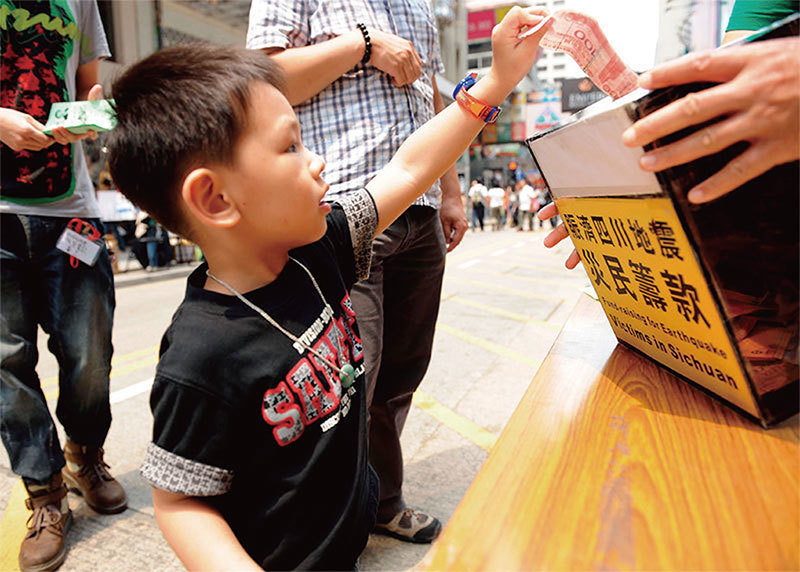 港人對中國的認同,在2010 年之後直線下墜,雨傘運動到反送中,差不多喪失殆盡。大陸地震與洪水,港人不再捐款了。圖為2008 年四川地震,香港捐款超過230 億。(AFP)