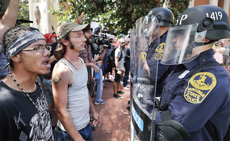 弗吉尼亞州夏洛特維爾2017 年發生的騷亂,旨在推翻美國總統特朗普。圖為弗州警察穿著防彈衣並使用防暴盾牌。(Getty Images)