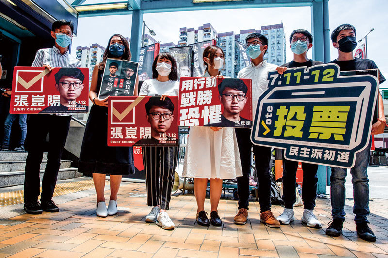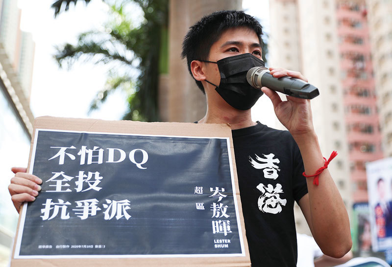 香港61萬人投票初選,令中共氣惱。14日中聯辦喉舌《大公報》稱要DQ(取消資格)所有參選人。圖為7月11日民主派立法會初選候選人岑敖暉呼籲民眾出來投票。(AFP)