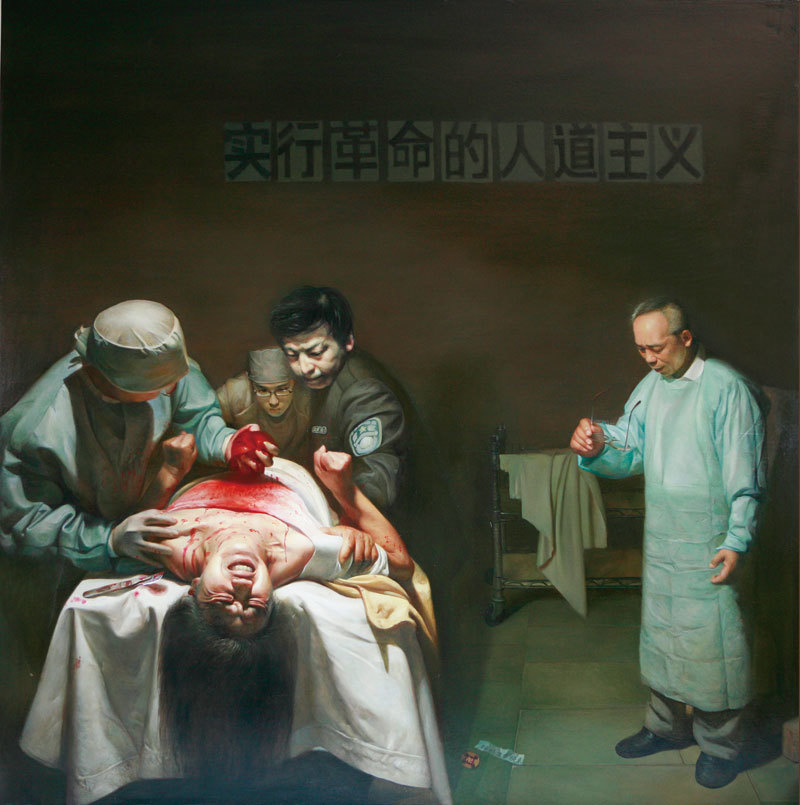 醫院五天就找到匹配的肝臟,醫生忌談供體來源,卻保證肝臟是年輕健康的。忌諱又神祕的回答,令家屬陷入矛盾及恐懼的境地。圖為寫實油畫〈活摘器官的罪惡〉。(大紀元資料庫)