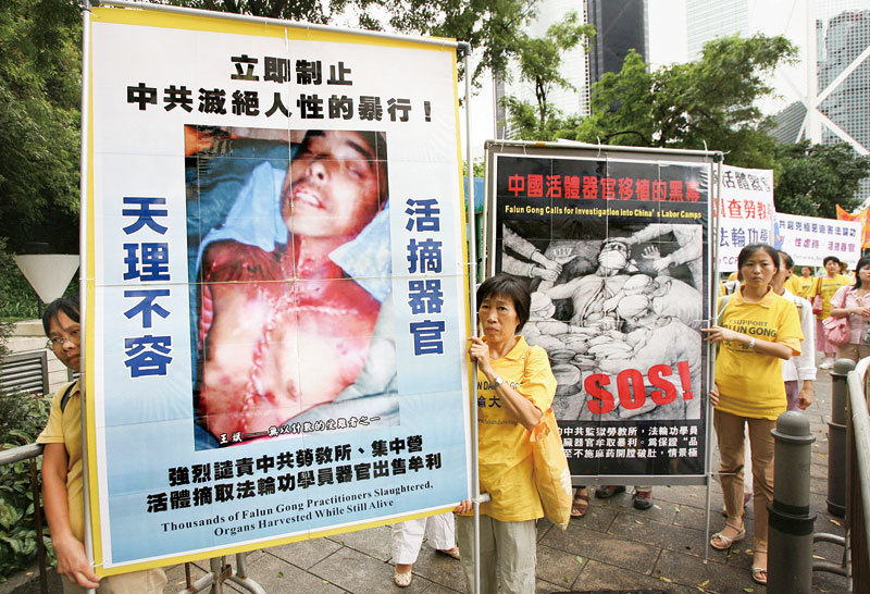 中共政權的邪惡程度,沒有你不相信的、只有你想不到的。圖為2006年6月28日香港法輪功學員遊行呼籲制止中共活摘器官的事實。(AFP)