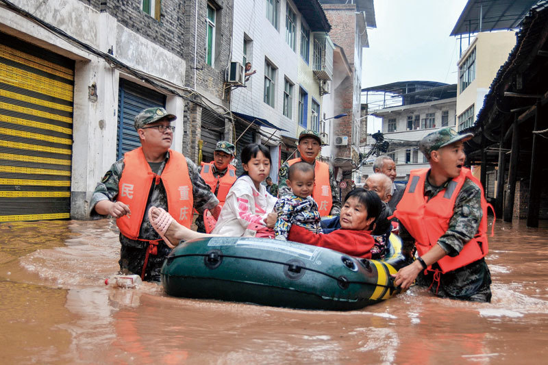 重慶水位受到三峽出庫水流的控制,若保武漢三峽大壩水位,重慶就得受淹。圖為6月22日重慶綦江流域出現1940年以來最大的洪水而疏散居民。(AFP)