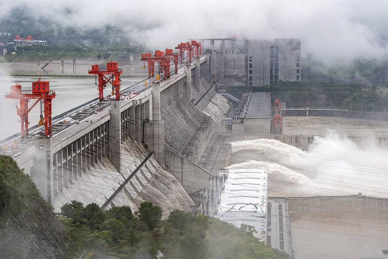 三峽大壩水位越高,上游重慶淹水越嚴重,洪水期間三峽反而需要多放水來減少重慶的壓力,然而這種做法根本不顧下游。圖為6月29日三峽大壩洩洪。(AFP)