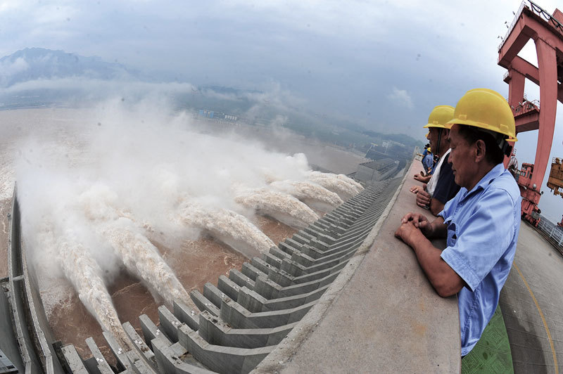 專家表示,三峽如潰壩,不僅會帶來水災,還會有20億至30億立方米的泥沙,其破壞力比洪水更厲害。圖為2012年7月24日三峽大壩洩洪。(AFP)