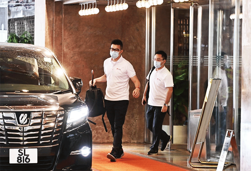 2020年8月5日上午,四名身穿寫有「Huo-Yan Laboratory(火眼實驗室)」字樣白色上衣的男子走出九龍維景酒店。(宋碧龍/大紀元)
