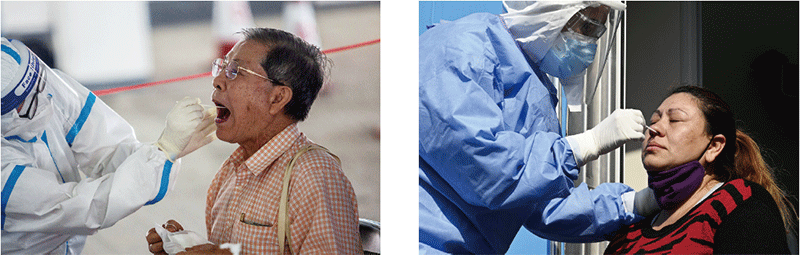 港府捨棄香港沿用的深喉唾液檢測(左),卻選定大陸廠商華大基因的子公司,要求人必須到現場做鼻咽拭子檢測(右),背後陰謀令人細思極恐。(AFP)