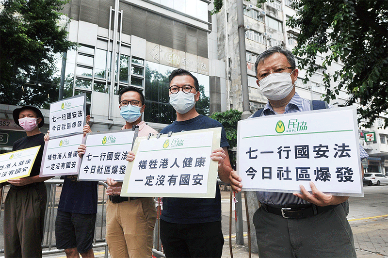 7月8日中共駐港國安公署掛牌當天新增確診案例開始猛增。圖為香港民主民生協進會7月9日在國安公署外請願。(宋碧龍/大紀元)