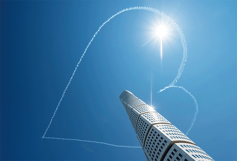 2020年7月17日瑞典第三大城市馬爾默地標大樓上空有飛行員畫出愛心,向染疫身亡者致意。(AFP)