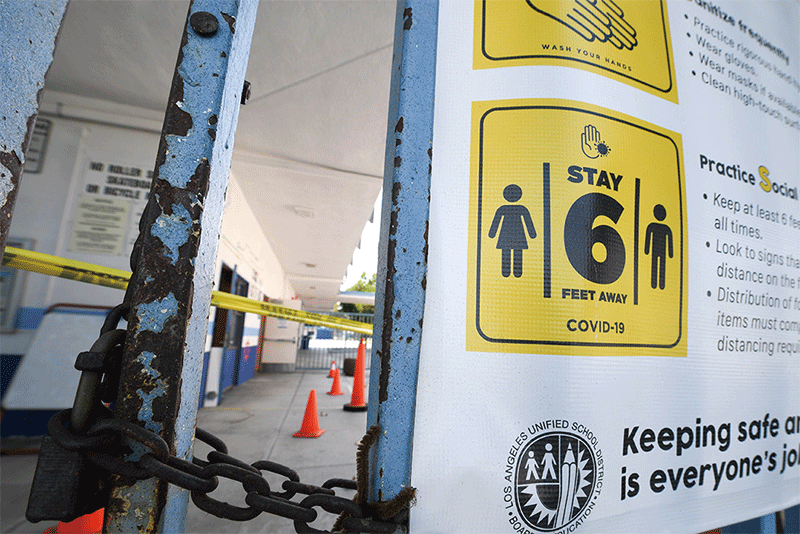 加州等居家令實行早的州染疫人數,在開啟之後大增。圖為2020年8月17日加州洛杉磯一個公立小學校園。(AFP)