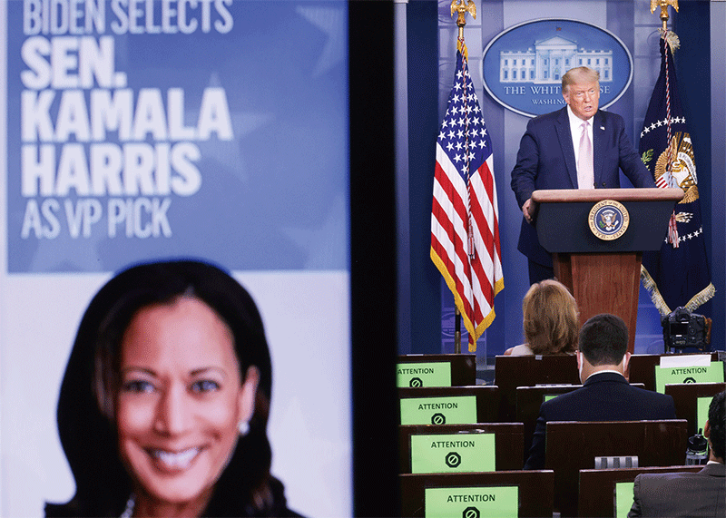 美國民主黨左派掌控的媒體涉嫌把原本有效抗疫的羥氯喹說成無效,加大感染人數,以逼迫特朗普下臺。圖為特朗普8月11日在白宮主持疫情簡報會,對民主黨拜登的副手賀錦麗發表個人看法。(Getty Images)