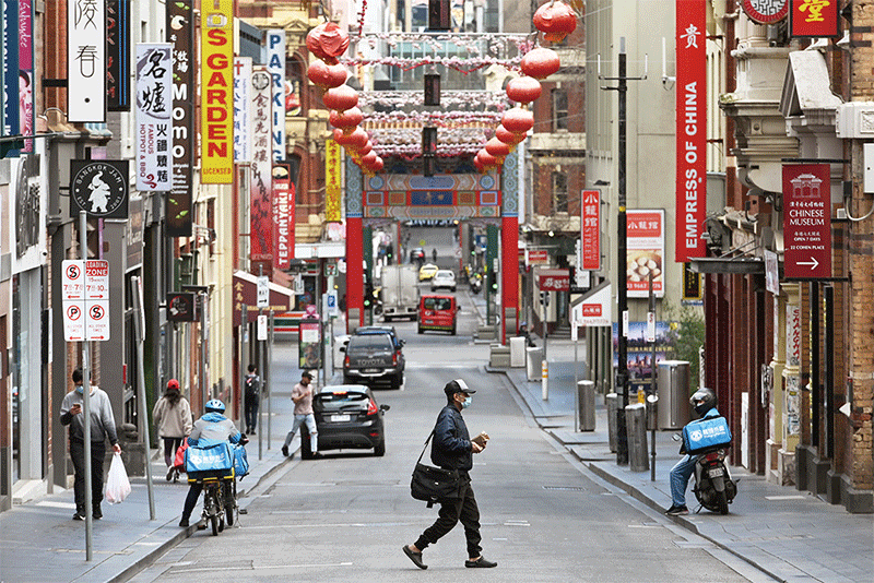 2020年8月13日在墨爾本唐人街地區的一條安靜的道路上穿越。(AFP)
