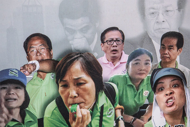 華融2015 年入主香港天行國際,天行國際老闆現任香港新界總商會會長,青關會主要頭目不少來自新界總商會。圖為法輪功展板上的青關會惡人榜。(余鋼/大紀元)