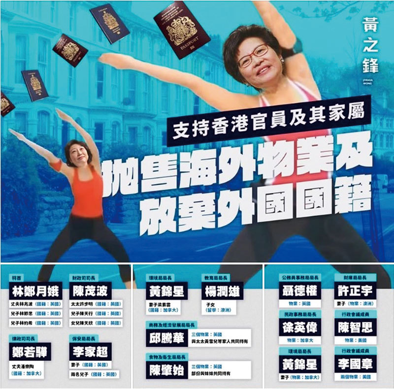8月8日,香港眾志前祕書長黃之鋒在臉書上披露,他手上有一份香港官員在海外擁有國籍或財產的名單。擁有英國國籍者:特首林鄭月娥的丈夫林兆波、大兒子林節思、小兒子林約希;財政司司長陳茂波的妻子許步明、兒子陳天行、女兒陳天欣;保安局局長李家超的妻子和兩名兒子。