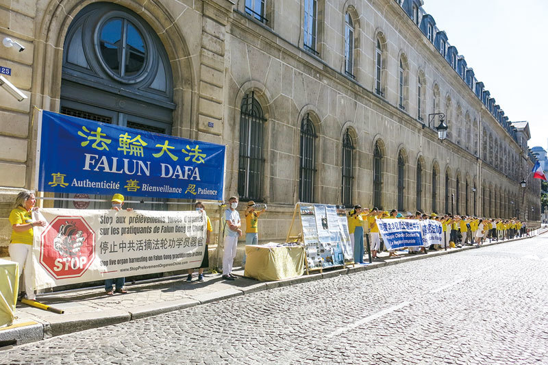 應邀發言的專家揭露中共邪惡本質,聲援法輪功堅持不懈的和平反迫害正義之舉。圖為2020年7月20日,法國部分法輪功學員在中共大使館前和平請願,呼籲停止迫害。(關宇寧/大紀元)