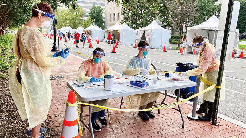 美國核酸檢測的數量最大,因而確診案例最多。圖為2020年8月14日華盛頓特區的一條街道提供COVID-19測試。(AFP)
