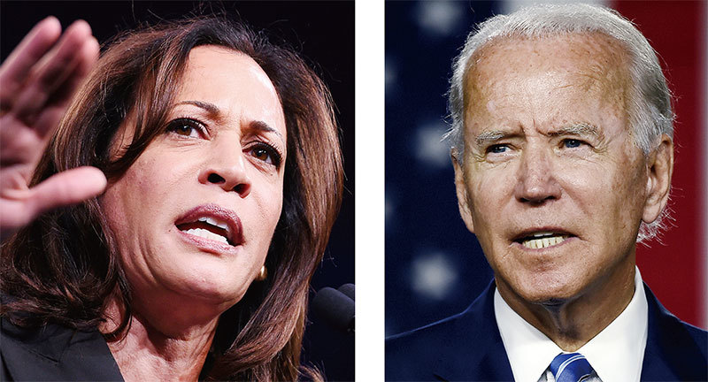 民主黨的拜登(右)選擇加州參議員賀錦麗(左)作為他的副總統競選夥伴,使賀錦麗成為第一位黑人背景、第一位亞裔背景的副總統競選候選人。(AFP)