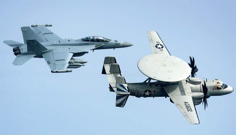臺灣將現役的6架鷹眼E-2K空中預警機升級至美軍現役的E-2D先進鷹眼等級後,將使臺灣形同一艘「超級無敵航空母艦」。圖為E-2D空中預警機。(AFP)