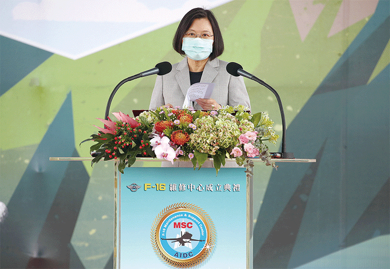 臺灣8月28日正式揭牌成立F-16戰機後勤維修中心。總統蔡英文致詞表示,捍衛中華民國臺灣主權、維持區域和平穩定,不是靠卑躬屈膝,而是要有堅實的國防。(中央社)