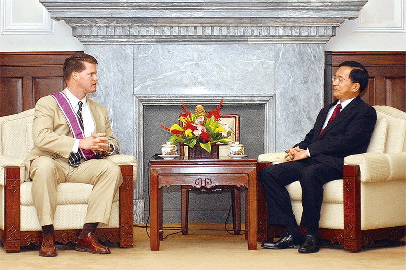 對於習近平認為美國不會為臺灣而戰,前美國國防部助理部長薛瑞福(Randall Schriver)表示那種看法是一場冒險的「豪賭」。圖為薛瑞福(左)2005年訪臺時會見總統陳水扁。(AFP)