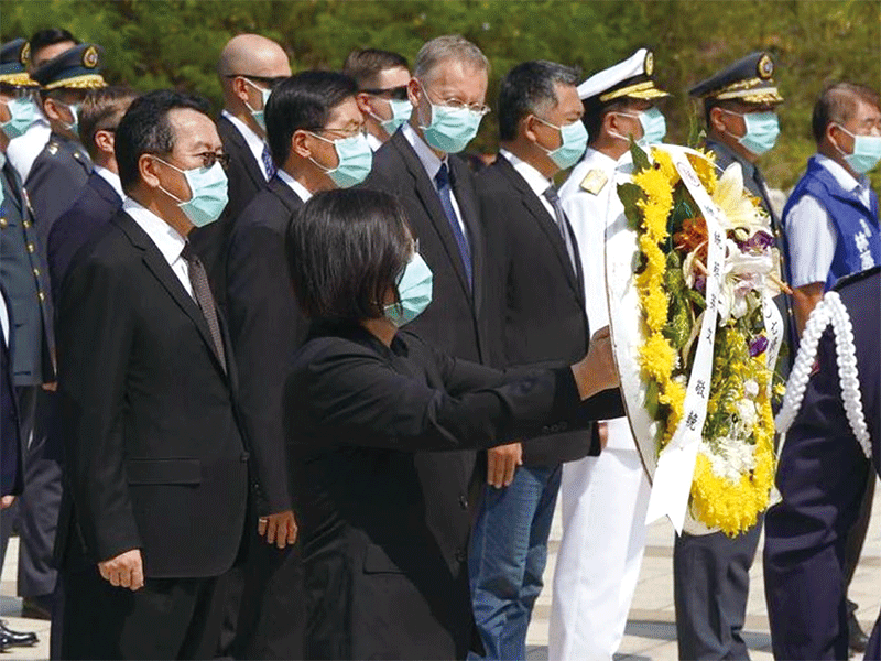 美國在臺協會臺北辦事處處長酈英傑(右五)與臺灣總統蔡英文(前)於8月23日出席金門「823戰役62周年紀念追悼活動」。(中央社)