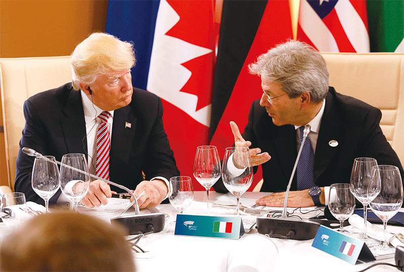 2017年5月意大利G7峰會期間,美國主流媒體指責特朗普在意大利總理講話時沒戴耳機,目中無人。事實上特朗普右耳戴上單片耳塞收聽翻譯。圖為2017年5月26日特朗普與意大利總理真蒂洛尼於G7峰會。(AFP)