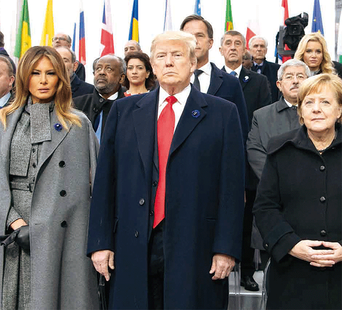2018年特朗普訪法期間,由於持續降雨直升機無法起飛,臨時取消前往美軍公墓的行程,遭媒體虛假指控。圖為2018年11月11日特朗普參加巴黎的一戰百年紀念活動。(Getty Images)