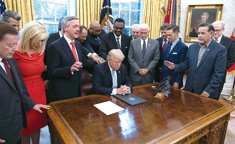 特朗普是基督徒,他的主要助手副總統彭斯、國務卿蓬佩奧也是虔誠的基督徒。圖為2017年9月1日特朗普與政府團隊在白宮橢圓辦公室為德州颶風災區祈禱。(AFP)